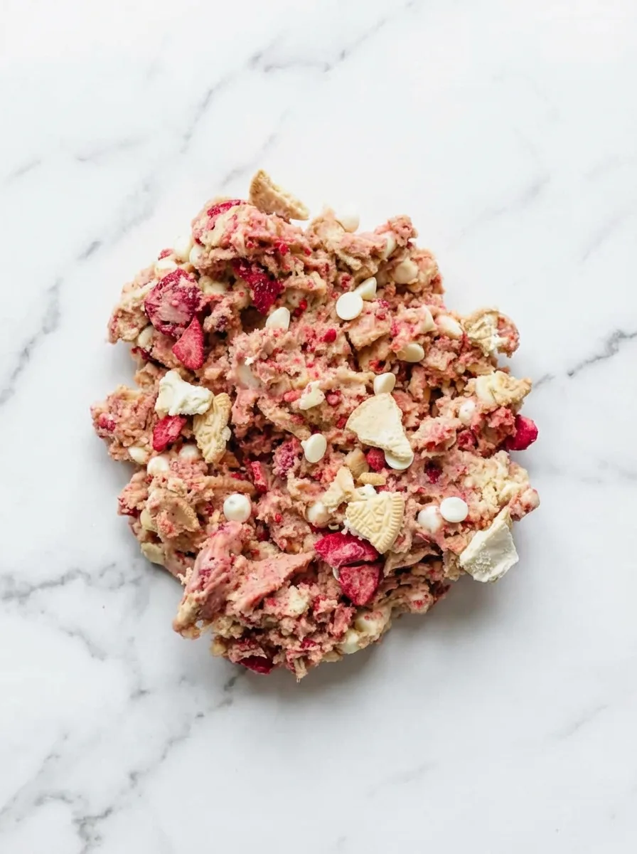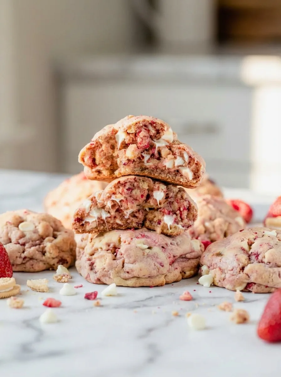 We don’t recommend fresh strawberries because their high moisture content creates soggy cookies. Freeze-dried berries provide concentrated flavor without altering texture. If using fresh, pat dry thoroughly and reduce amount by half.