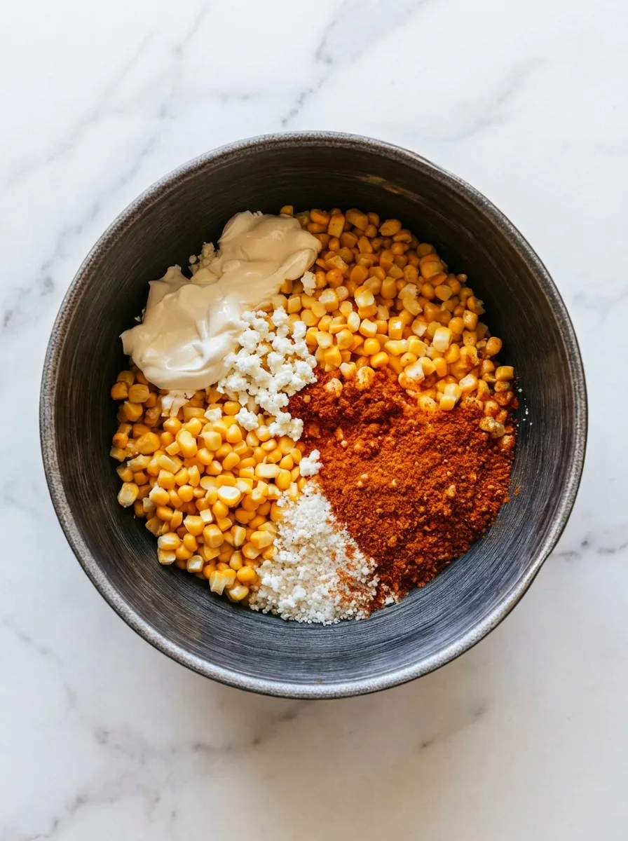 - Mix corn kernels with half sour cream, mayonnaise, cotija cheese, chili powder, and sliced onions