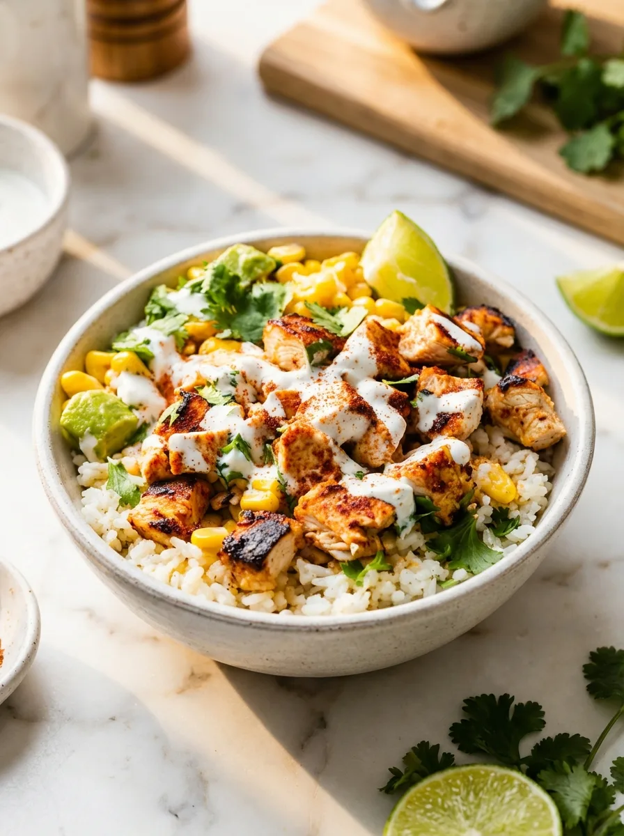 Flavorful chicken rice bowls with street corn toppings in under an hour