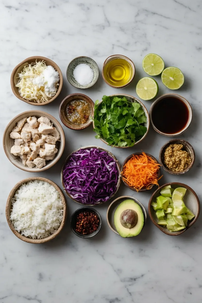- Step 3: Assemble the Bowls – Scoop rice into bowls. Top with chicken, carrots, cucumbers, and cabbage. Drizzle with coconut lime sauce and sprinkle with cilantro, green onion, and sesame seeds.