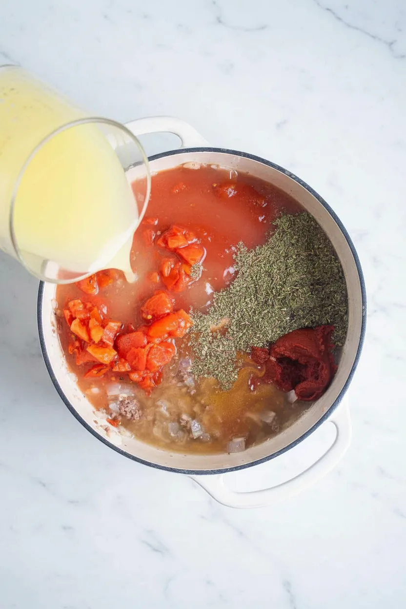 3. Pour in diced tomatoes, tomato sauce, tomato paste, vegetable broth, Italian seasoning, salt, and pepper. Bring mixture to a gentle boil.